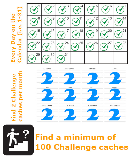 - a find of 1 Challenge cache on every day of a month, so 1st, 2nd, 3rd, 4th all the way to 31st of the month. (any month)