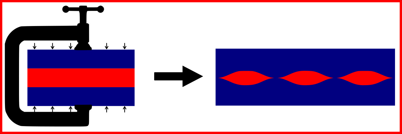 Figure 1: How boudins form. The red layer is more competent compared to the surrounding blue rock and compression (imagine a vice squishing them together) results in the red layer breaking and forming eye, lens or sausage shaped features called boudins.