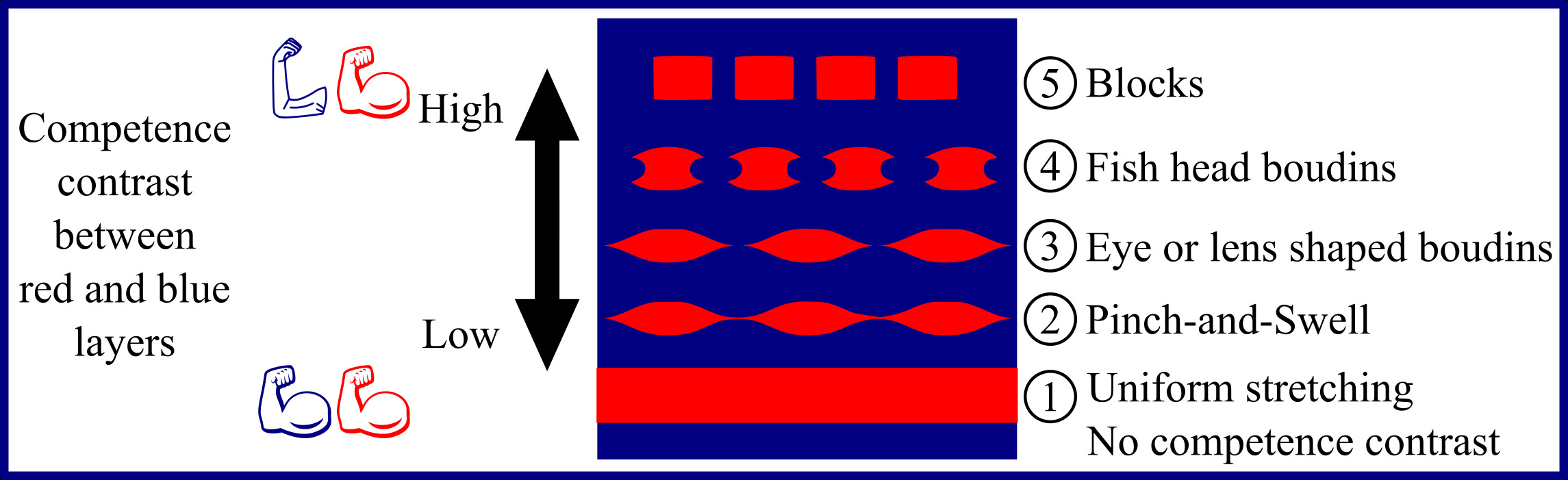 Figure 2: How the competence contrast of adjacent rocks affects the shape of the boudins.
