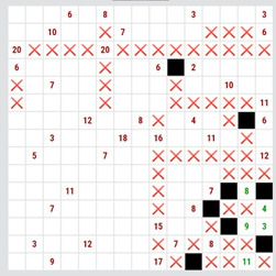 A poté se ještě podíváme na trojku vpravo dole. Trojka znamená, že políčko s trojkou plus nějaká další dvě políčka vodorovně nebo svisle budou bílá. S trojkou ale sousedí právě dvě políčka s číslem: nad ní je čtyřka, vlevo devítka, a políčka s číslem jsou automaticky bílá. Tím pádem už potřebná dvě políčka máme a trojku můžeme označit za ukončenou, nikam dál už bílá políčka svisle ani vodorovně od trojky vést nesmí. Tj. je potřeba označit černě políčko nad čtyřkou, pod trojkou a vlevo od devítky. A zase všechna políčka sousedící s černými políčky stranou můžeme zakřížkovat.