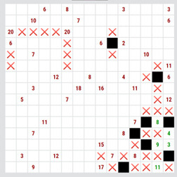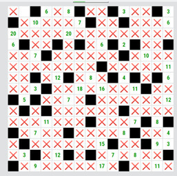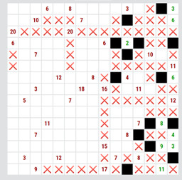 Jsou tu dvě dvacítky a jedna sedmnáctka (taky osmnáct a šestnáct, ale ty jsou uprostřed a proto zatím moc nepomůžou). Nejjednoduššeji to pochopíte, když bude číslo úplně na kraji. Mrkněte na sedmnáctku dole. Vodorovně může být maximálně 15 políček (to jsou všechna políčka v mřížce) včetně políčka se sedmnáctkou. I kdyby byla všechna bílá, ještě stále dvě políčka chybí, takže minimálně dvě políčka musí být bílá směrem nahoru (teď už do toho sedmnáctku nepočítáte, takže s ní tři). Políčka, o kterých víte, že budou bílá, značíte křížkem. Pokud to je políčko s číslem, tady políčko s patnáctkou, neznačíte ho nijak, to se automaticky rozumí, že je bílé. (pochopitelně bílých políček v řádku může být méně a směrem nahoru více, ale dvě jsou minimum, které budou směrem nahoru bílé a ty už můžete křížkovat)