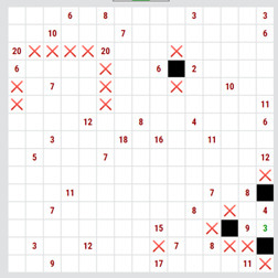 Další věc, kterou na začátku zkuste, je podívat se pro změnu na nejmenší čísla. Když se podíváte na dvojku (dvojka znamená, že právě jedno políčko vedle ní bude bílé), můžete hned označit černě políčko směrem k šestce. Jako políčko s číslem je políčko s šestkou bílé, kdyby tak bylo políčko mezi oběma čísly bílé, měli byste bílá políčka tři a vy potřebujete dvě. Takhle se tedy dvojka rozšířit nemůže. Jakmile vám někde vznikne černé políčko, automaticky všechna čtyři políčka sousedící s ním stranou označte křížkem. Černá políčka spolu nesmí sousedit stranou.