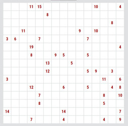 Na následujícím obrázku je nyní prázdný rébus, tak, jak vypadá, než se dáte do luštění. Jak na to? Bude to hlavně o počítání políček. Počítáte políčka vodorovně a svisle, plus samotné políčko s číslem. Já si na to třeba vytvořila strategii, že při prvním počítání (je jedno, jestli nejdřív jedu vodorovně nebo svisle) počítám i políčko s číslem, v druhém směru už ho pak nepočítám. Dobré je při každém počítání to ještě jednou přepočítat, pokud se překouknete, bude se to opravovat už hodně těžko....
