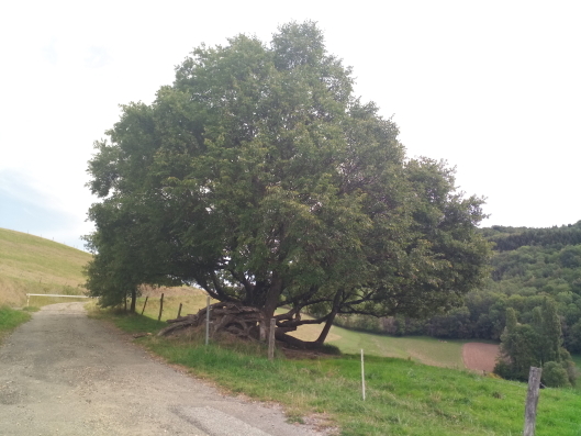 Ce chêne solitaire, perché à 700m d’altitude à flanc de colline, s’est couché au sol probablement à la suite d’un violent coup de vent. Il a du se battre pour rester bien vivant puisque les intempéries l’on mis à terre, bousculé, déraciné, il a su lutter pour survivre et s’en est sorti, il continue sa croissance malgré une partie de ses racines à l’air.Un accident qui remonte à plusieurs dizaines d’années et qui aurait dû lui coûter la vie.