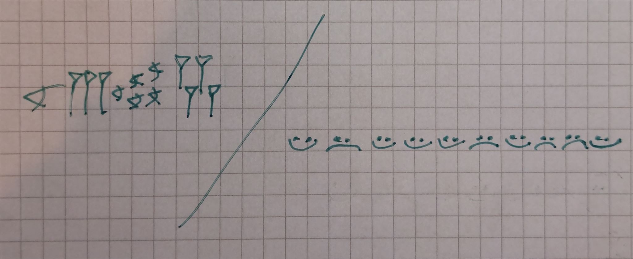 Er meinte doch dazu irgendwas von „X-Team - aber ohne "-Team"“? Oder war das O-Team, ne klingt auch falsch…. Und damals laberte er was von einem Turm und nicht Berg! Hää? Der linke Teil schaut irgendwie aus wie „Tage zählen im Gefängnis“ und der rechte Teil ist so neumodisches Emoji-Zeugs. Hat einer einen Plan, was das sein könnte?