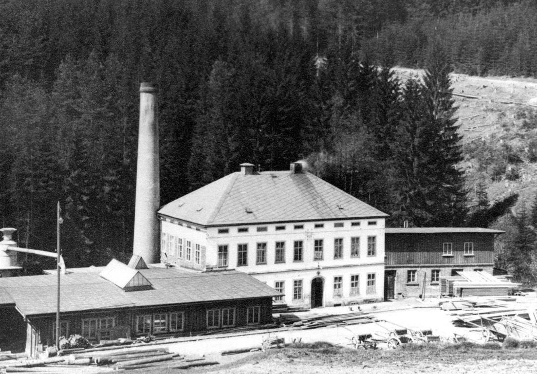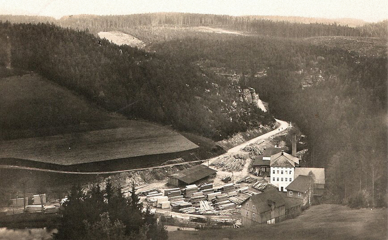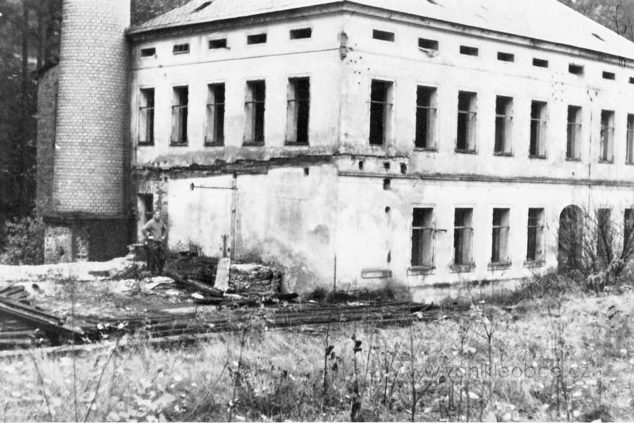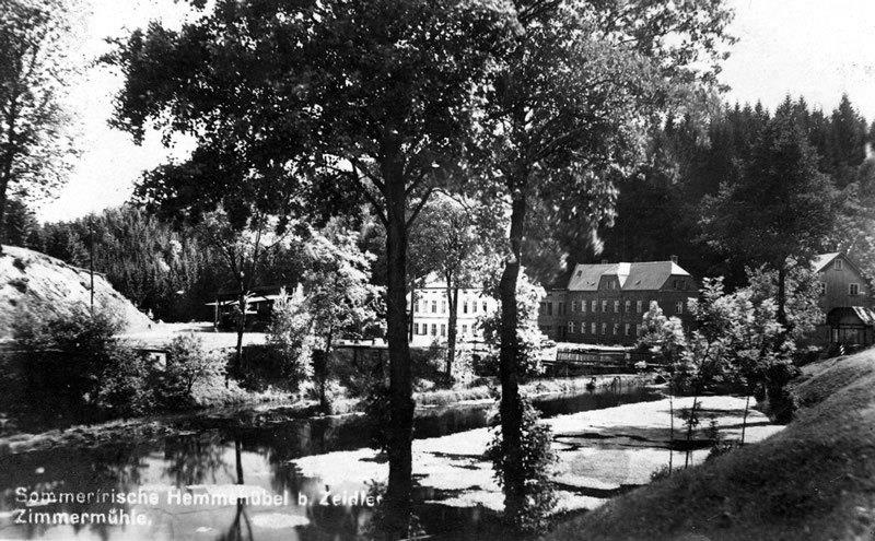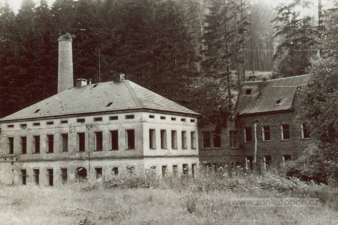 There had been a long tradition of lumber processing in the area of what is today known as Kopec. In 1592 the site of the yet to be built settlement was already marked as “The Old Sawmill” („Am alten Sägewerk“) on the map of Matthias Oeder. One of the well-known miller families were the Zimmers. A mill document dated 1692 notes a mill and a sawmill (later house number 32) with a hereditary lease to Johannes Zimmer. This included living quarters, a stall and fishing rights on Ziedlerbach (today Brtnický potok). The mill existed until the eighteenth century, later only the sawmill remained. The sawmill was expanded after 1919 and the stream was covered, an effort that required moving of 2000 m³ of soil. In the twentieth century the importance of machine production had grown. For example, wooden glider planes for the 1936 Olympic Games in Berlin were made here, typically such an order would have been given to already well-known and established businesses. The sawmill saw military exercises of Peoples' Army of Czechoslovakia between 1952 and 1957. The whole place fell into disrepair as the government had trouble finding an administrator. According to contemporaries the sawmill was finally razed down in 1963.