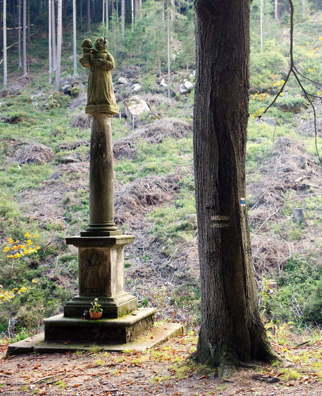 Near the location of the Zimmer's sawmill one can find a statue of St. Anthony of Padua, which is closely tied to the saw-mill's history (you can see it on the title photograph right above the smokestack). It was erected in 1707 as a memorial to a tragic accident that killed J. Zimmer when a haul of lumber fell on him. The writing on the front of the statue's plinth says: “On the sixteenth of July 1707 at eleven o'clock my life ended here. Johannes Zimmer”. The statue used to stand right in front of the sawmill, but it was an obstruction to traffic, so it was moved about 100 m downstream sometime in the twenties. In 1998 it was stolen and presumably sold to Germany. A replica was made and is what you can see at the site today.