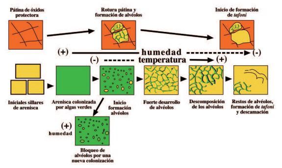 A medida que crecen, los taffoni crean un microclima húmedo que favorece su crecimiento. Los nidos de abeja se convierten en nichos favorables para la instalación de microorganismos (líquenes) que, a su vez, agravan la meteorización.