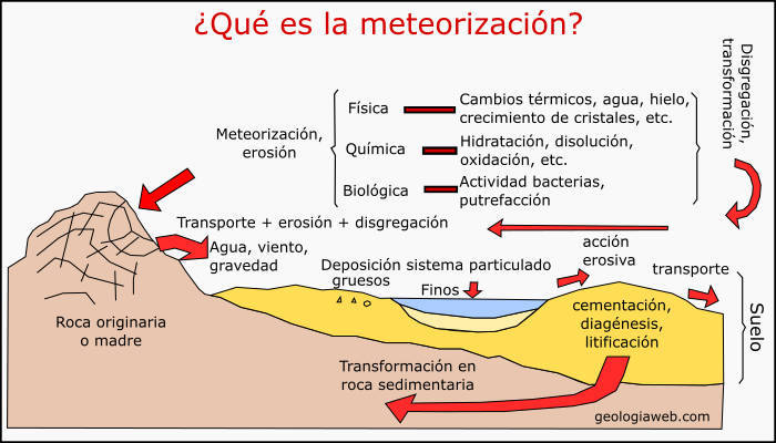 La meteorización es una combinación de procesos físicos y químicos que desintegran la roca en el mismo sitio (in situ), sin embargo, no ocurre un transporte de aquellos materiales desintegrados.