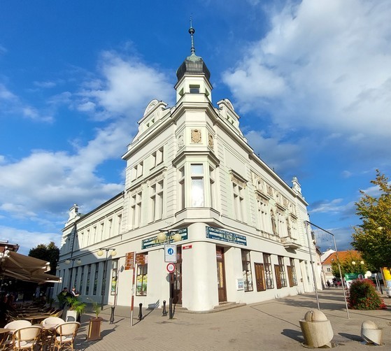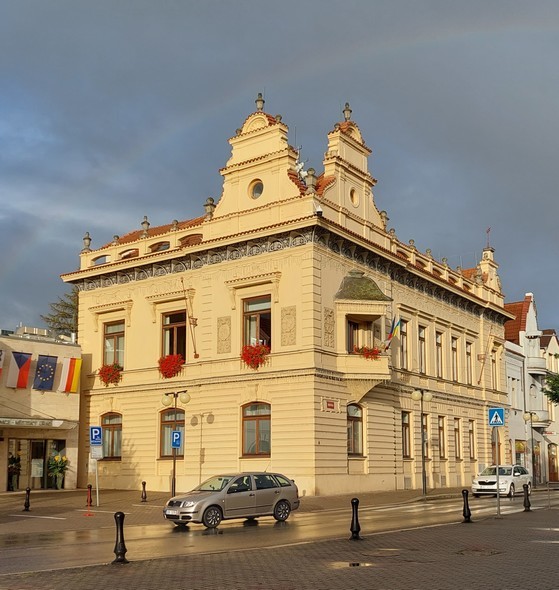 Na první stáži stojíte před novou radnicí. Nová radnice v Poděbradech je rohová budova v západní části náměstí Jiřího z Poděbrad. Postavena byla dle plánů architekta Edmunda Chaura v roce 1906. Nová radnice je novorenesanční jednopatrový dům, ke kterému byla později přistavěna moderní přístavba, dnes je zde sídlo městského úřadu. Podívejte se na boční balkón a hlavně na desku vpravo vedle něj. A= počet postaviček pod letopočtem 1906.