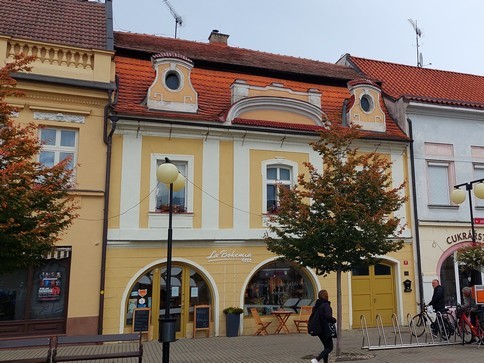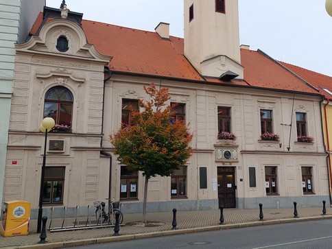 Stojíte před městským domem čp 37, který si jako jediný zachoval svůj barokní vzhled. Vás bude zajímat oranžová poštovní schránka u lampy před domem. Číslo schránky je 2B