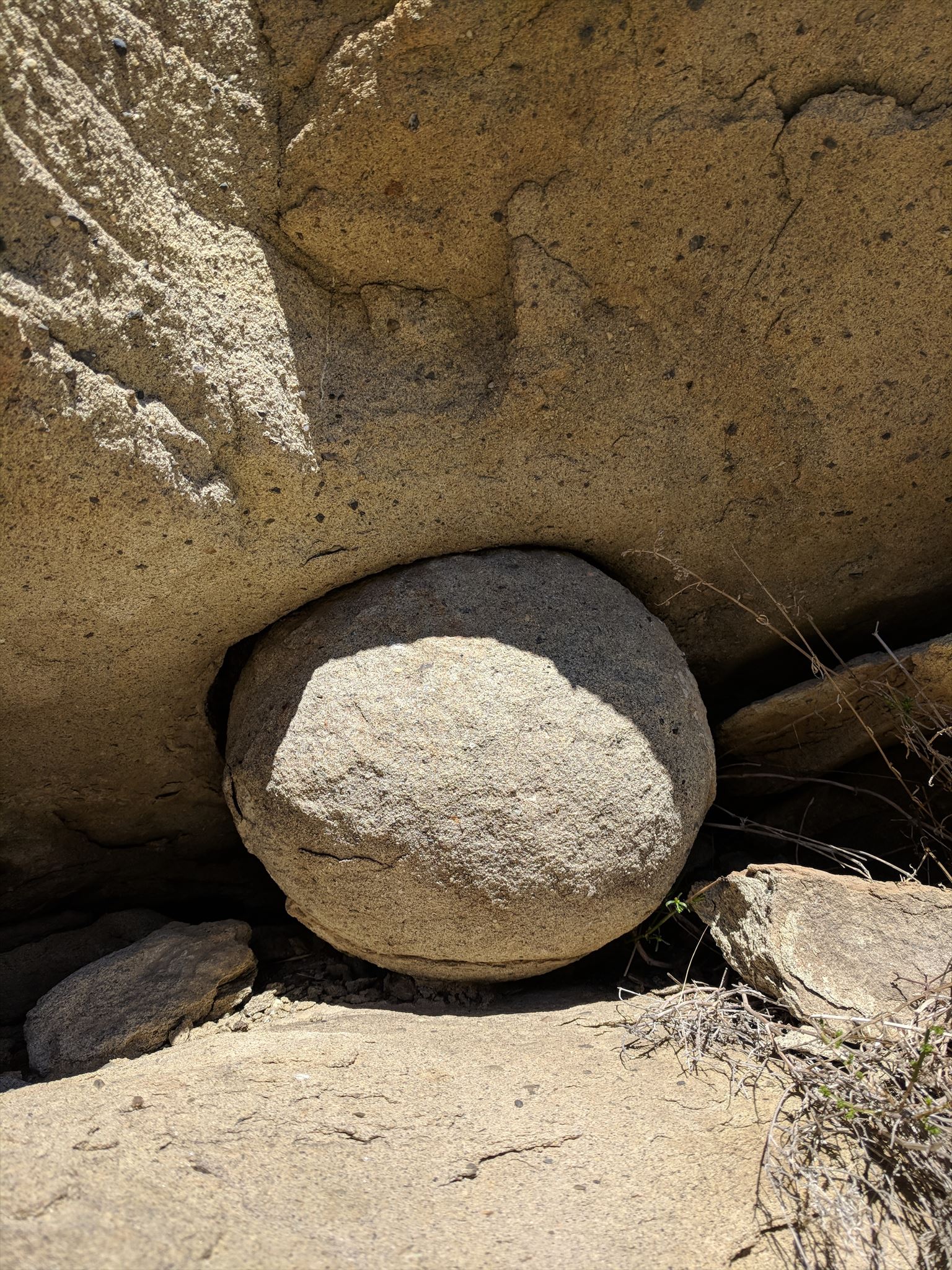 Once you arrived at the posted coordinates ignore GPS. Description of location: the posted coordinates are just a short scramble on up from the Rocky Peak Fire Road. Please be careful and choose your route wisely. You do need to watch your step and beware of rattle snakes. Once at the proper level you can walk around this rock formation and it is somewhat level. Again: you do need to watch your step and beware of rattle snakes. If walking clockwise, on your right hand side, at about 4' high you find a terrific example of weathering. You find a sphere! Be very GENTLE with this sphere: CAUTION: sphere is not a toy, and BE CAREFUL not to pinch your fingers. This is what you are looking for [spoiler picture]: Sphere.