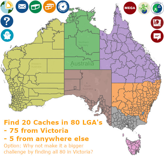 1. You must find 20 caches in 80 different Local Government Areas (LGAs), at least 75 of which must be in Victoria. The remaining 5 LGAs can be from anywhere else in Australia on geocaching.com. Why not set yourself an extra challenge to find 20 in all 80 Victorian LGAs.