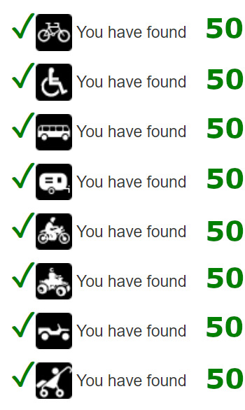 1. You must find 50 of each of all the attributes with wheels "Bikes allowed", "Wheelchair-accessible", "Public transit available", "Truck-driver-/RV-accessible", "Motorcycles allowed", "Quads allowed", "Off-road vehicles allowed" and "Stroller-accessible" on geocaching.com