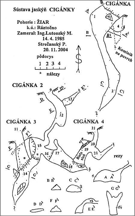 Nákres - pôdorys sústavy jaskýň Cigánky, zameral Ing. M. Lutonský v r. 1985, zakreslil P. Strečanský v r. 2004