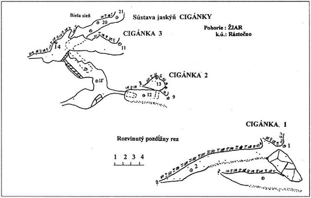 Nákres - rozvinutý pozdĺžny rez sústavy jaskýň Cigánky, zameral Ing. M. Lutonský v r. 1985, zakreslil P. Strečanský v r. 2004