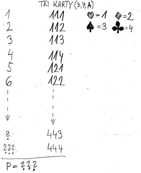 Úloha: Máme jeden balíček „žolíkových“ (správně whistových) karet se čtyřmi barvami a 13 hodnotami (2 3 4 5 6 7 8 9 10 J Q K A). Celkem tedy je v něm 52 karet, nejsou v něm žádné žolíky ani prázdné karty. Kolika způsoby je možné realizovat kombinací tří „hraběnčiných“ karet (trojky, sedmy a esa) z tohoto balíčku? Můžete zkombinovat i víc stejných barev, třeba srdcovou trojku, srdcovou sedmu a pikové eso. Počet možností dosaďte za P a počítejte: