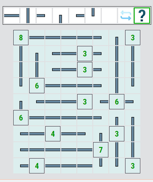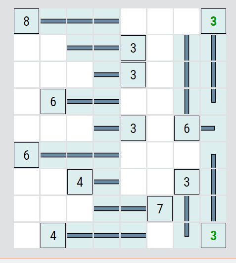 2) Druhý princip je vycházet ze samotných čísel z hlediska, kolik mají prostoru. Ze začátku pomůžou hlavně větší čísla (která mají málo prostoru). Tak např. pokud máte šestku v pravém dolním rohu a oběma možnými směry (nahoru a vlevo) máte čtyři volná polička, pak v každém směru můžete doplnit čáru do dvou políček. (pokud bude v jednom směru čára ve čtyřech políčkách, musí vždy být ještě ve dvou v druhém směru). To je trochu princip jako z malovaných křížovek....
