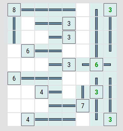 2. řádek: Na dvě políčka vlevo od trojky dosáhne pouze trojka. Z toho pak vyplývá, že napravo může vést max. na jedno políčko. Na předposlední políčko 2. řádku tak musí vést čára od šestky. A v posledním sloupci na tři políčka pod horní trojkou dosáhne pouze tato trojka.