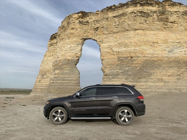 This is one of my favorite pictures of my 2015 Jeep. It was taken at Monument Rocks in Western KS during the Mingo Madness Event on 5/8/2021. While most folks think KS is flat it has a few interesting rock formations such as Monument Rocks, about 45 minutes south of Mingo. This Jeep was my cache mobile at the time. It made it's maiden caching trip to Seattle, WA for the 2015 Block Party. It came home with 5000 more miles on it then when we left. Since we live in the middle of the country this Jeep has gone to the West Coast and North into Canada, the East Coast, Southern Texas and to the tip of the thumb in Door County, Wisconsin...geocaching along the way.
