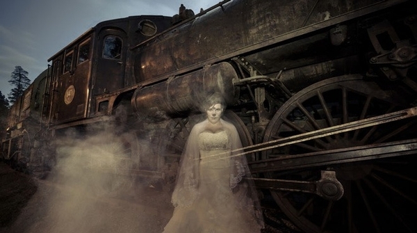 Ik hoefde niet erg lang achter de trein aan te fietsen, want al snel minderde hij vaart. Voor de trein zag ik een bouwsel opdoemen wat verdacht veel op een station leek. "Maar we zijn toch nog lang niet bij station Lelystad aangekomen?", spookte het door mijn hoofd. De trein hield midden in de polder stil bij een verlaten station. De deuren van de voorste coupe gingen open en mijn adem stokte even door wat ik toen zag. Een schimmige vrouw zweefde uit de trein en hield even stil voor de locomotief en keek mijn kant op. "Zou ze me hebben gezien?"