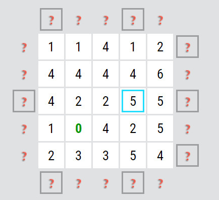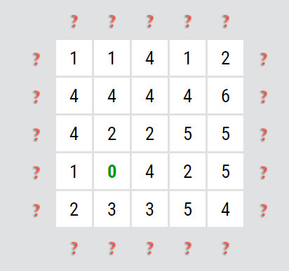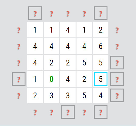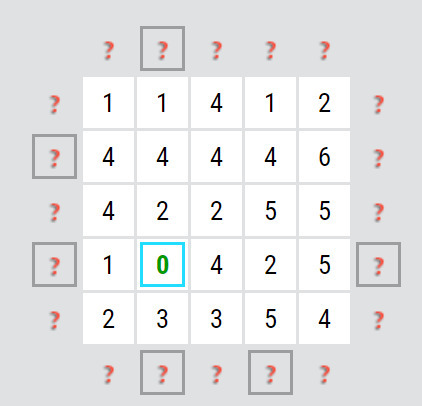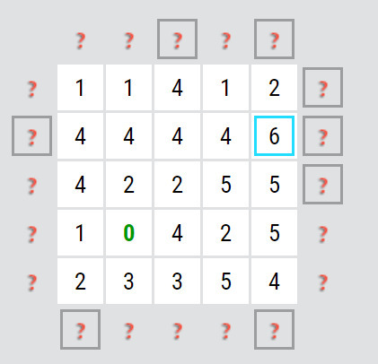 Zkoušíte čísla tak dlouho, až najdete takové, kde se dá odrazit. Začneme třeba šestkou. (obr. níže) Kliknutím zjistíte, které šipky na políčko mohou ukazovat. Ve stejném řádku/ sloupci/ úhlopříčce tady není žádná nula, jen v krátké úhlopříčce je jednička. Z toho akorát vyplývá, že v tomto směru může být jen jedna šipka (nebo taky žádná) a pak ve třech směrech dvě šipky nebo ve dvou směrech dvě a v jednom jedna, nic konkrétního ale doplnit nelze. Zkusíme tak jiné číslo.