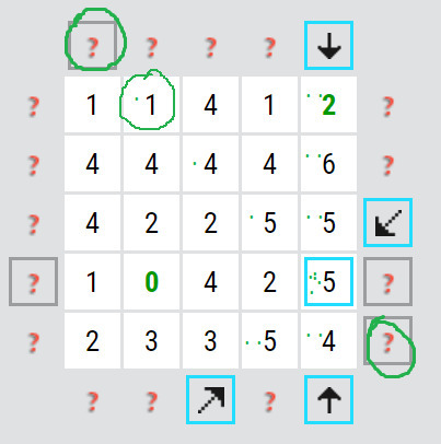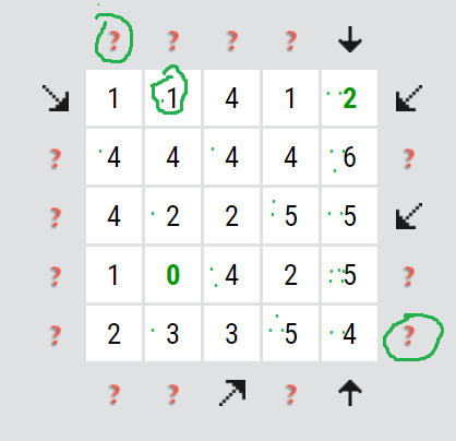 A tady je zas trochu nevýhoda luštění online, kde není možné si nijak označit, když víte že bude v daném směru využita právě jedna ze dvou šipek, ale nevíte jaká. (otazníky, které jsem zakroužkovala zeleně) Stejně tak není možné si k číslu poznamenat, kolik šipek už na číslo ukazuje, což někdy může být výhodné (právě proto, že když třeba na čtyřku už ukazují tři šipky, tak už chybí jen jedna a tím pádem se čtyřka začne chovat jako jednička, tj. v dalším směru už na ni může ukazovat jen jedna šipka, ne dvě). Proto si pro větší přehlednost můžete rébus i vytisknout,a při každém použití šipky si k číslům dělat tečky (tak jak jsem to udělala v dalším obrázku), abyste věděli, kolik šipek už na číslo ukazuje (online to zjistíte vždy jen pro jedno číslo, když na něho kliknete). Ale zase nevybrala jsem až zas tak těžké rébusy, takže by to mohlo jít i bez toho... Pokud je číslo už hotové (ukazuje na něho už daný počet šipek), tak vám zezelená. Poté už na něho logicky žádná další šipka směřovat nebude, tj. začne se chovat jako nula.