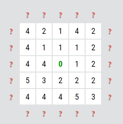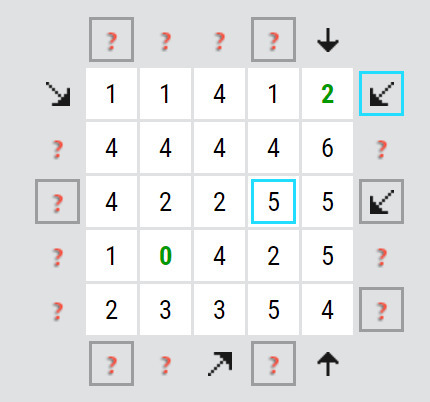 A jak luštit? První věc, podívejte se, jestli je ve mřížce nula a které šipky na ni mohou ukazovat, tak jak to vidíte na obrázku výše. Nula znamená, že na ni nesmí ukazovat žádná šipka. Výhoda by byla, kdyby tak na nulu mohla ukazovat některá z osmi šipek u rohů mřížky, protože ty mají jen dvě možnosti natočení, takže pokud nemůžou ukazovat na nulu, zbyl by jen jeden možný směr. U tohoto rébusu tomu ale tak není, všechny šipky, které mohou ukazovat na nulu, mají tři možnosti natočení, zbývají tak ještě dva možné směry. Musíme tedy začít nějak jinak....