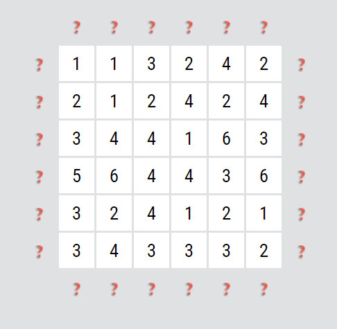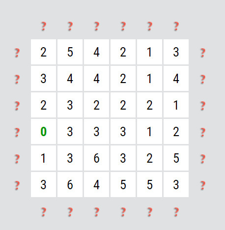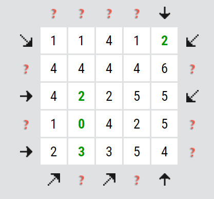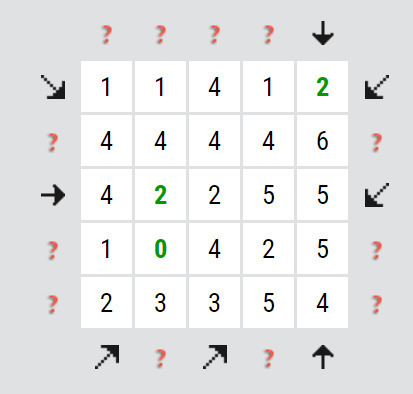Jak? Hledejte vysoká čísla (5, 6 a vyšší), případně i trochu nižší čísla (3, 4 a vyšší), pokud jsou v hlavní úhlopříčce čtverce, protože tam je jen 6 možných šipek. Dále hledejte taková čísla, u kterých je ve stejném řádku/ sloupci/ úhlopříčce nula, případně jednička. Ty vám totiž omezují možnosti. Nula znamená, že na daný řádek/ sloupec/ úhlopříčku nesmí ukazovat žádná šipka. Jednička pak znamená, že na daný řádek/ sloupec/ úhlopříčku může ukazovat maximálně jedna šipka.