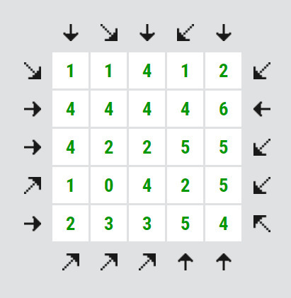 Tenhle rébus je možná na pochopení maličko složitější a luštění není úplně intuitivní, tak se hned na začátek podívejte na příklad a jeho řešení. Řešený příklad také najdete zde: Arrows №301408 (grandgames.net). Tam si můžete taky vyzkoušet, na které strany mohou ukazovat šipky.