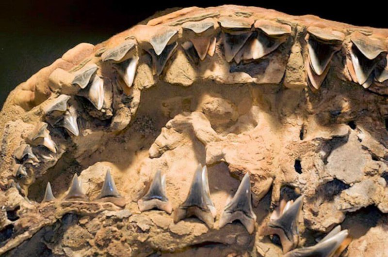Une mâchoire fossile du requin Carcharodon hubbelli, du Pérou, vieille de 15 millions d'années. Outre les dents, le cartilage de la mâchoire est fossilisé (ce qui est relativement rare pour du cartilage). 🔽