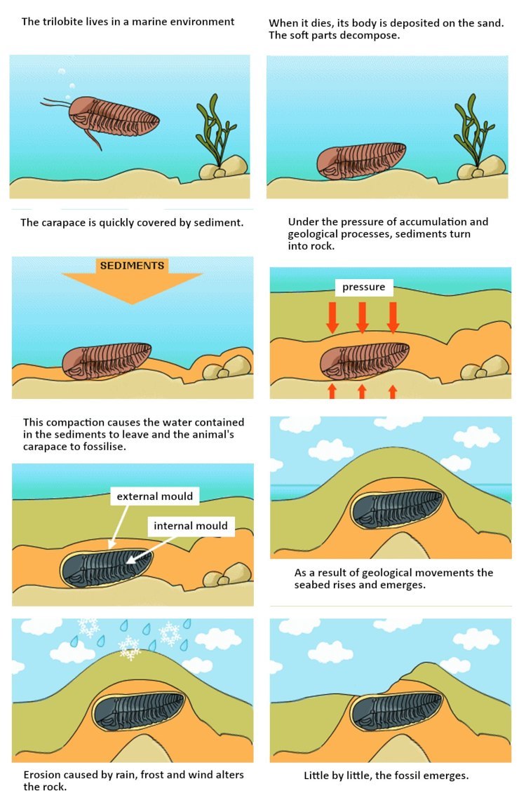 Generally, when the organism dies, the process begins with the bacterial decomposition of the soft parts (viscera, skin). Then the hard parts (skeleton, shell, teeth) must be quickly buried under a layer of loose sediment, which gradually compacts into rock.