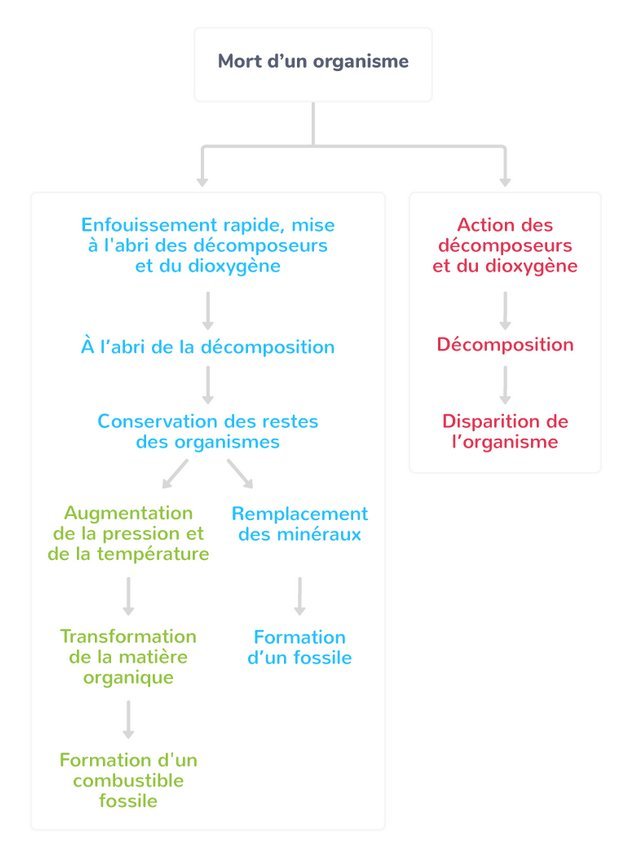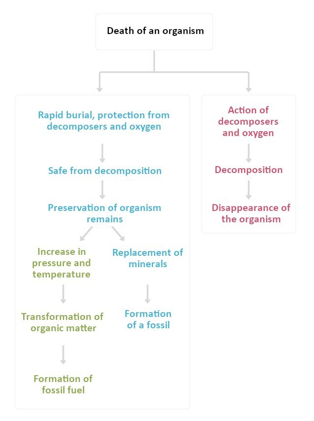 Généralement, à la mort de l’organisme, le processus commence par la décomposition bactérienne des parties molles (viscères, peau). Ensuite, les parties dures (squelette, coquille, dents) doivent être rapidement ensevelies sous une couche de sédiments meubles, qui se compactent peu à peu en roche.