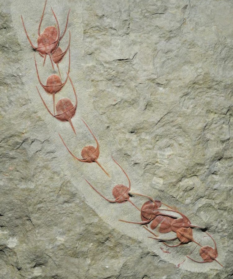 Linear trilobite assemblage, Ampyx priscus dating from 480 million years ago (Fezouata shale, Morocco). Photo by Jean Vannier, Laboratoire de géologie de Lyon. 🔽