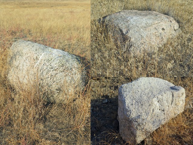 Red Rock Ravine is lined with exotic rocks that have no business being among the topography. These boulders are of Granite, an igneous rock formed under pressure, with a coarse grain crystal structure. The glassy grey material is Quartz and the dark speckles are Biotite or Hornblende. They differ from a closely related granite looking rock called Gneiss. They are metamorphic rock created under greater pressure with fine grain crystal structure forming light and dark bands. These boulders were ice rafted to the lower slope of Rattlesnake Mountain from northern Idaho during the Missoula flood and dropped as the ice rafts melted some 13,000 years ago.