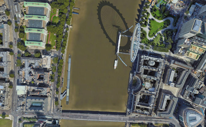 Bridge H Clue: I finished the previously-mentioned novel in which Earth is known as Blight Insular Three. In my current read, A Choice of Gods by Clifford Simak, the vast majority of the Earth's population instantaneously vanishes, leaving empty cities behind. As I was scanning the area of the London satellite image above, I noticed something amazing that would fit the novel perfectly: There are NO PEOPLE on the sidewalks, parks, tennis courts, cricket fields... I broadened the search and found that from Google Earth's point of view, London is completely deserted! Even the downtown bridges, such as Westminster Bridge, normally crawling with pedestrians, are unpopulated.