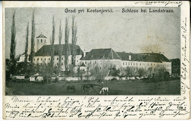 Pogled na nekdanji samostan v Kostanjevici na Krki okoli 1900; hrani Galerija Božidar Jakac Kostanjevica na Krki.
