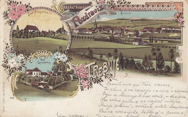 Trebnje with the manor and the church in Vina Gorica, postcard, sent in 1899; kept by DM NM.