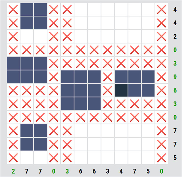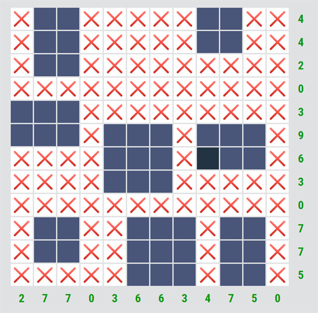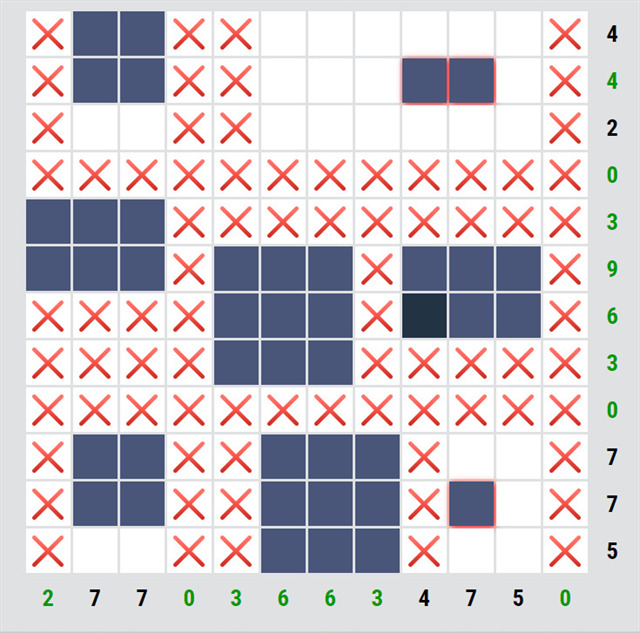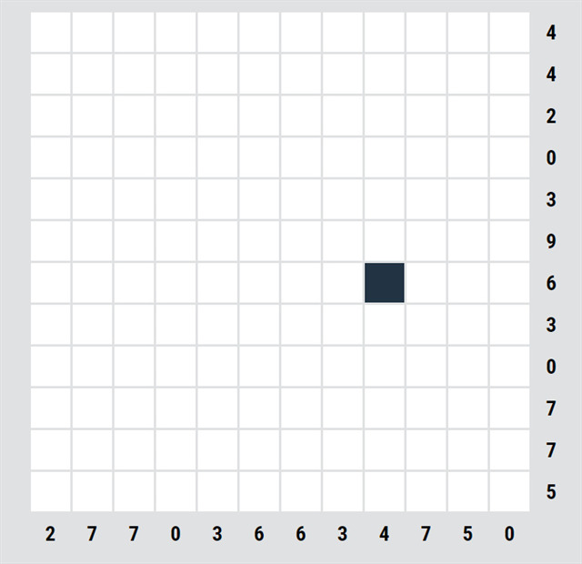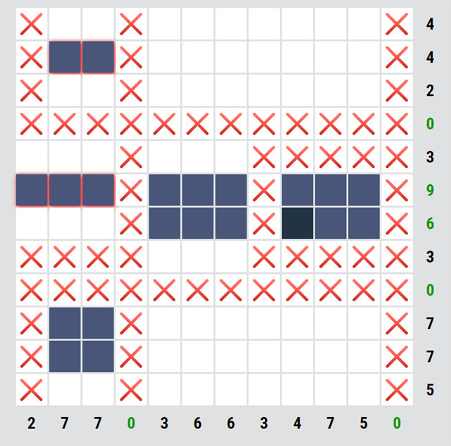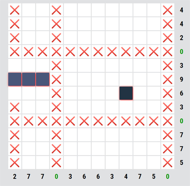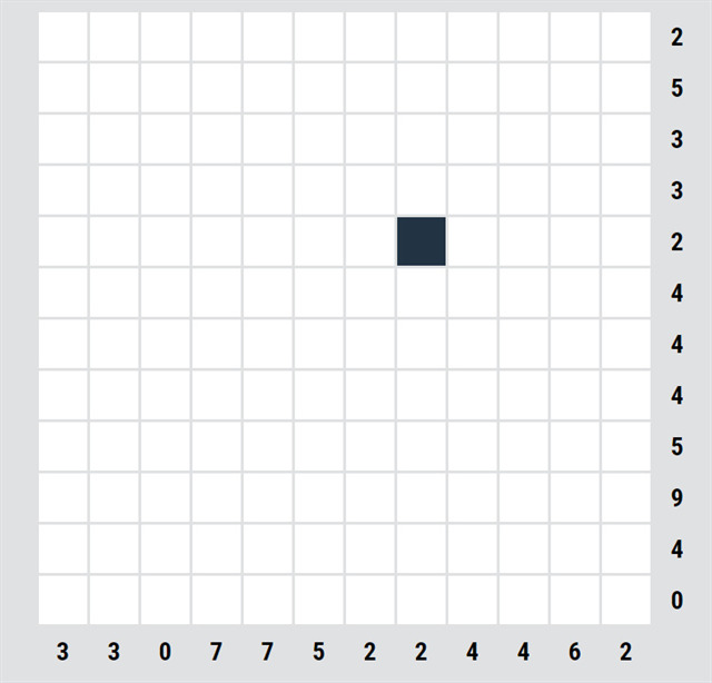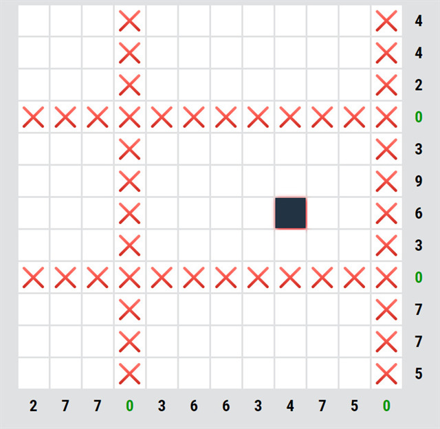 U některých rébusů je na začátku nějaké políčko doplněné, tady je jedno. První krok je jednoduchý, u řádků/sloupců, kde je nula, můžeme všude udělat křížky.