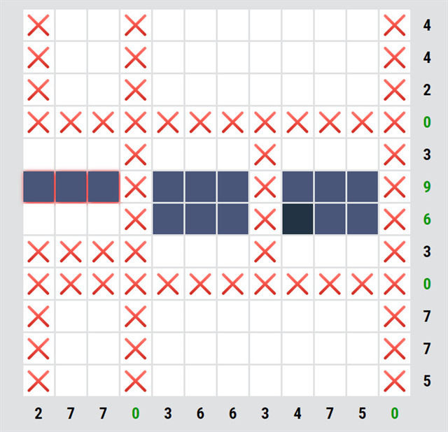 Nyní si už můžeme dokončit (dokřížkovat) řádek s šestkou. Útvar vlevo se tak musí rozšířit směrem nahoru. Poté můžeme dokončit řádky s trojkou.