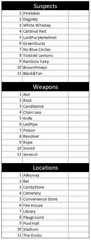 At each stop you will need to answer a question pertaining to that location. After successfully answering the question you will be awarded with a combination of suspects, locations and murder weapons.You my want to print out the sheet in the gallery to help keep track of the clues.