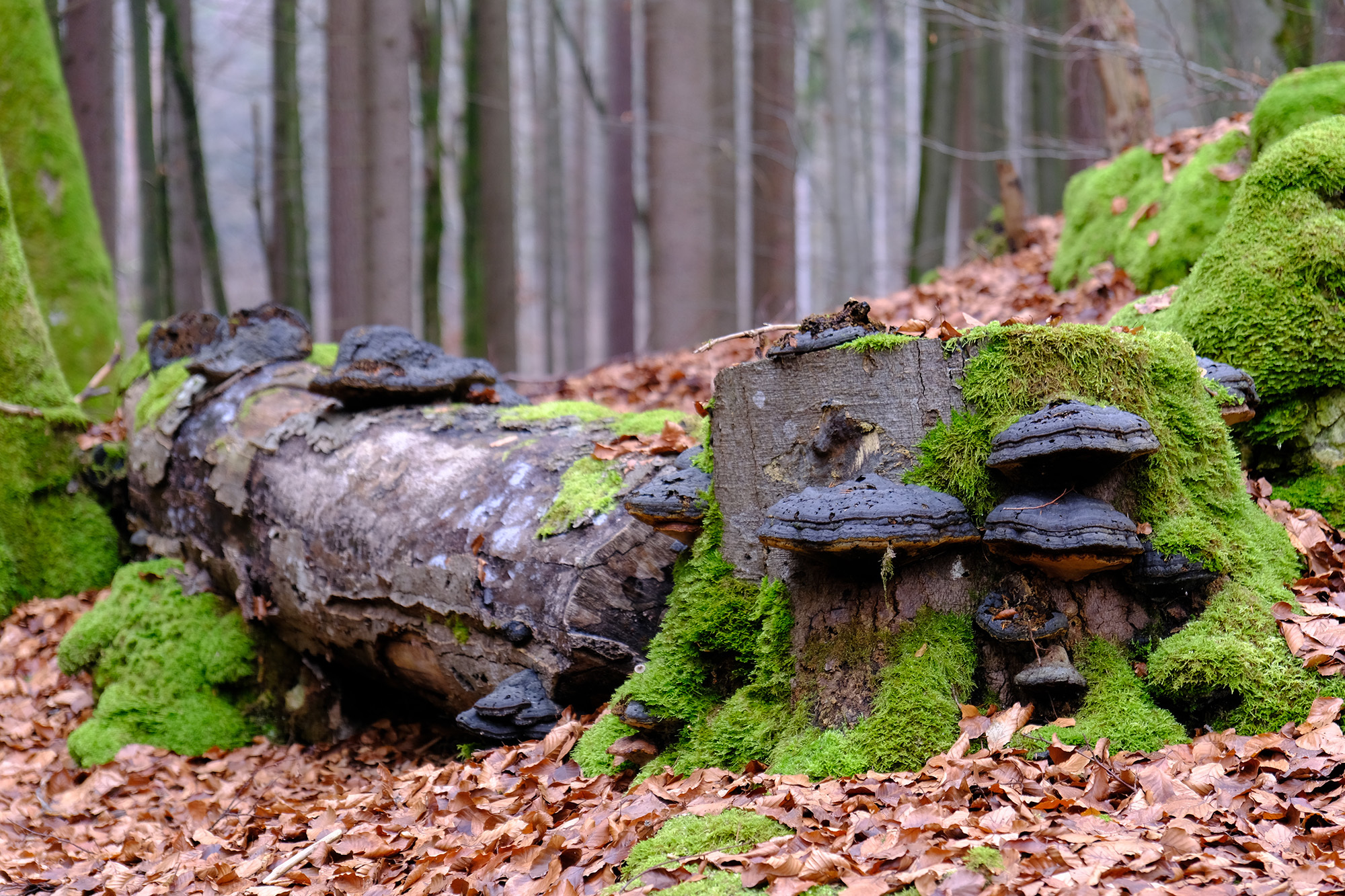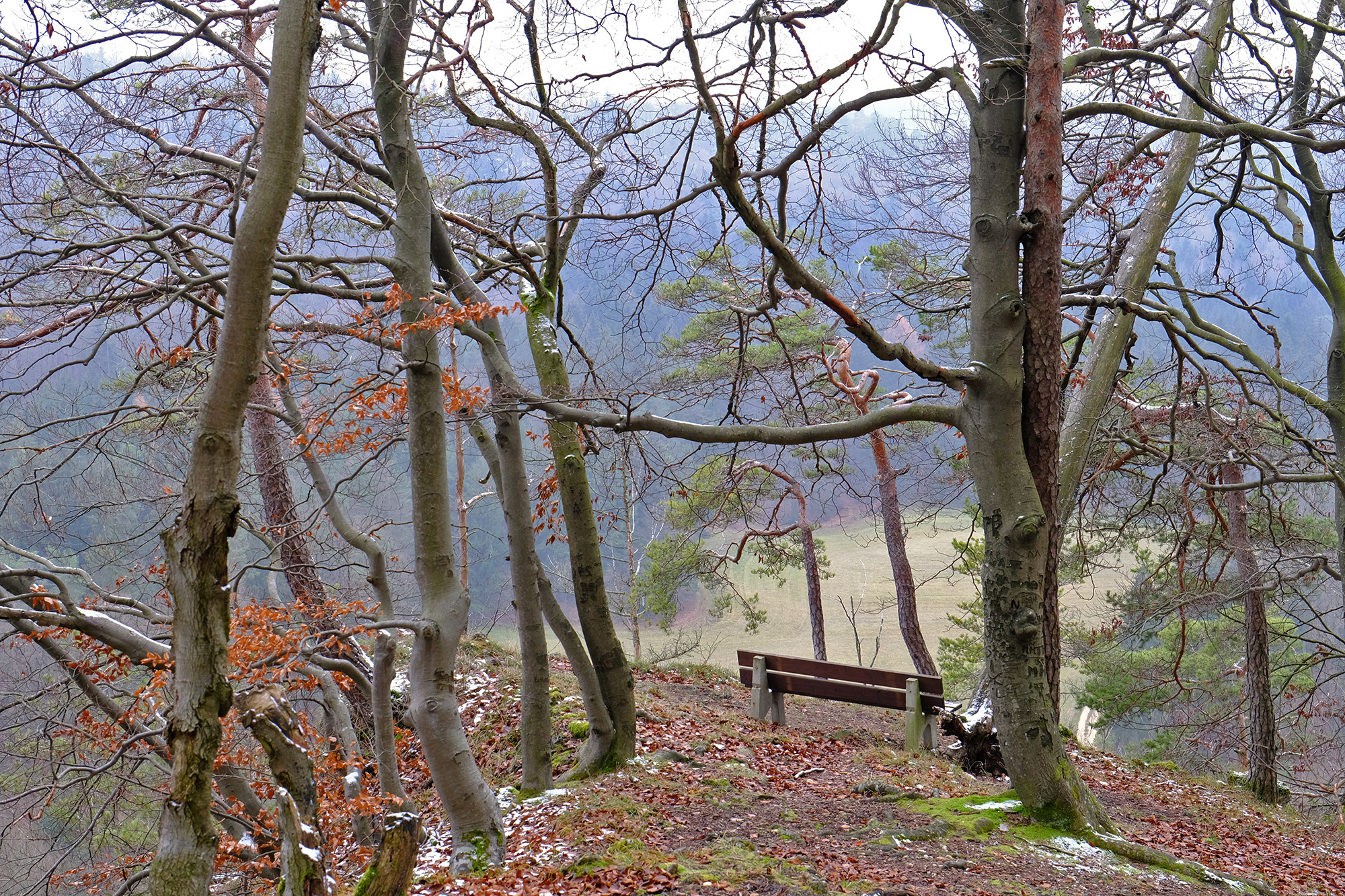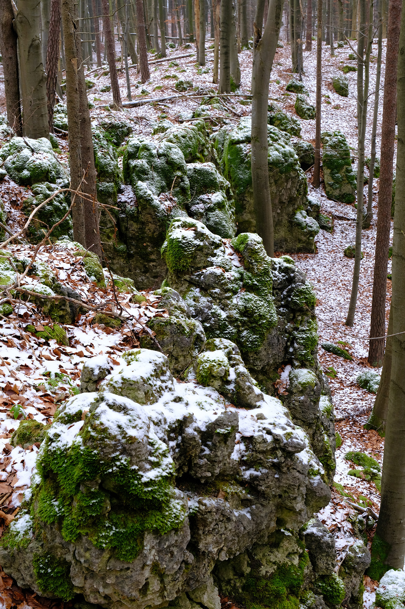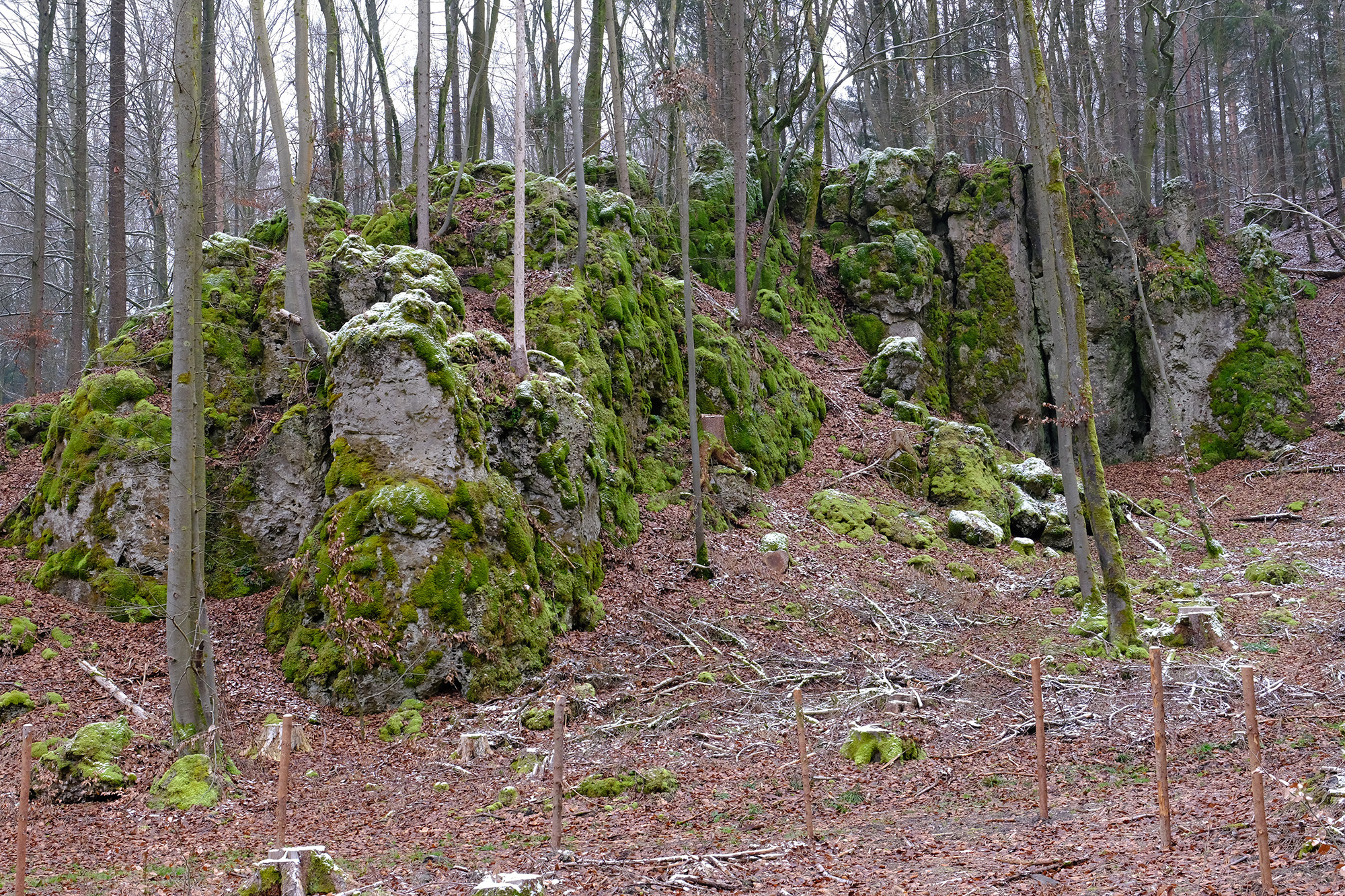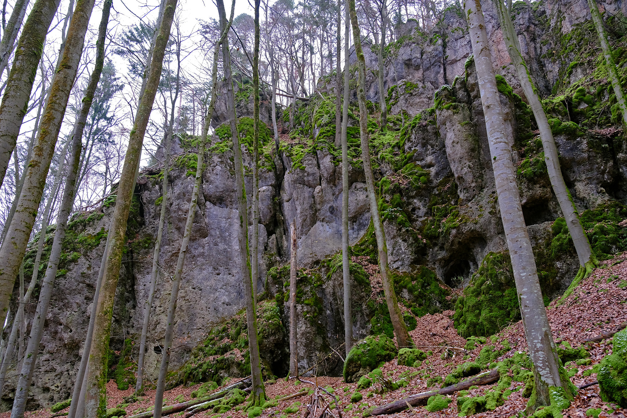 Von dort geht es geradeaus weiter in den Wald, wieder auf einem unmarkierten Pfad. Einige Wegpunkte erleichtern die Orientierung in diesem Abschnitt und bringen einen schließlich zur Kante eines halb offenen Felsenkessels.