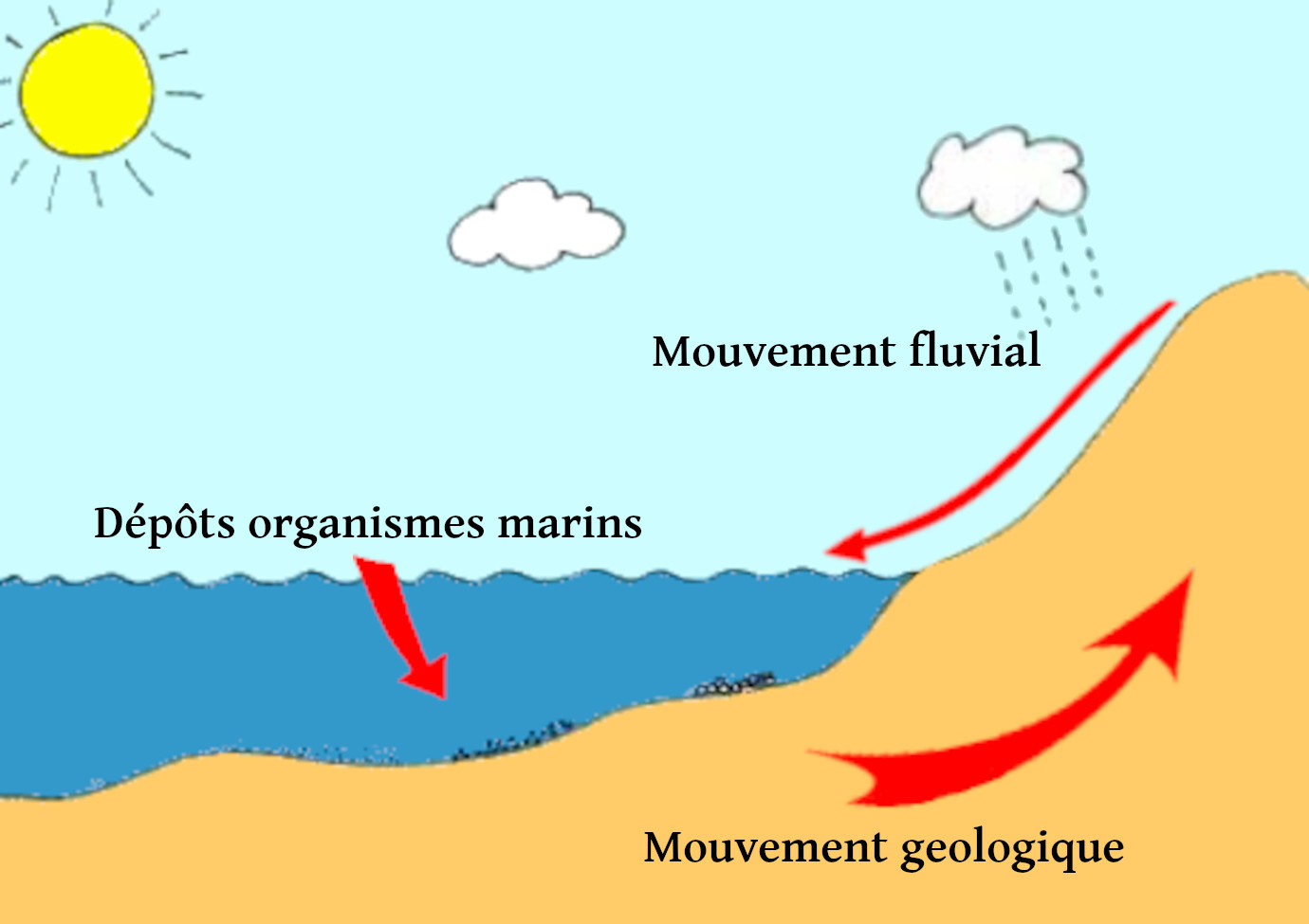 Les ouragans, les forts courants ainsi que les vagues détruisent les coraux, les algues et les coquillages, les broyant naturellement. Le sable qui en résulte se dépose sur les fonds marins et se déplace horizontalement au fil du temps. Il faut des milliers ou des millions d'années pour obtenir une roche calcaire à partir de ces dépôts. En effet, ils doivent se compacter et se cimenter sous l'effet de la pression exercée par les couches successives de dépôts qui les recouvrent au fil du temps.