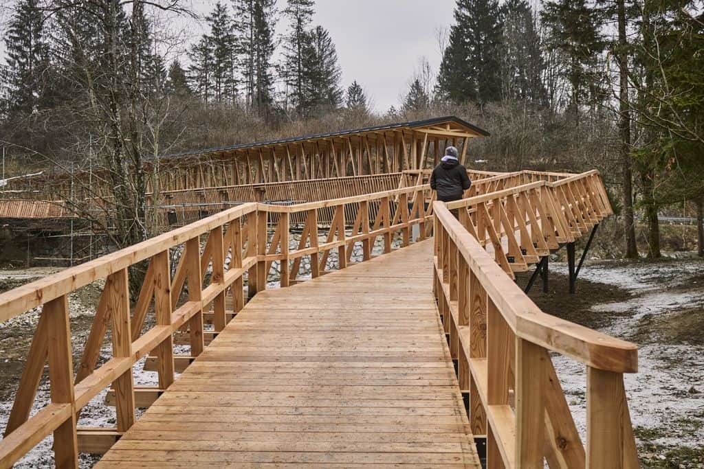 In December 2020, the bicycling network of Bohinj was expanded by a covered bridge across Sava Bohinjka river. Cycling trail to the lake is now easier to reach from the middle section of the valley. Of course, you can also cross it on foot. Interesting wooden bridge is the final element in landscaping of Na Rju area. The area has been known for decades as a spot where the bravest and/or the craziest plunge into cold water. Architects who designed it believe it represents a modern hayrack above the water, enriching the modern alpine architecture by drawing inspiraton from tradition. It's hard not to agree with them.