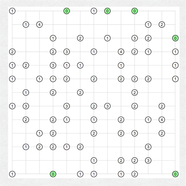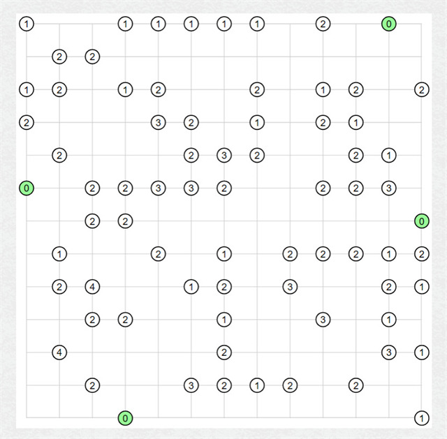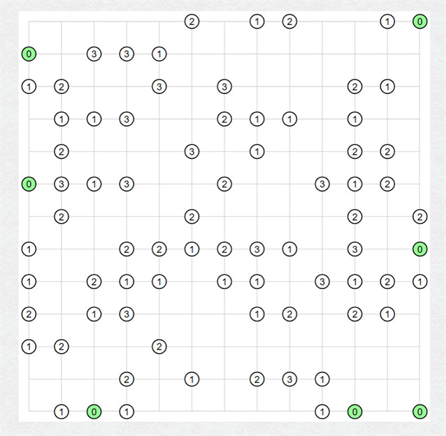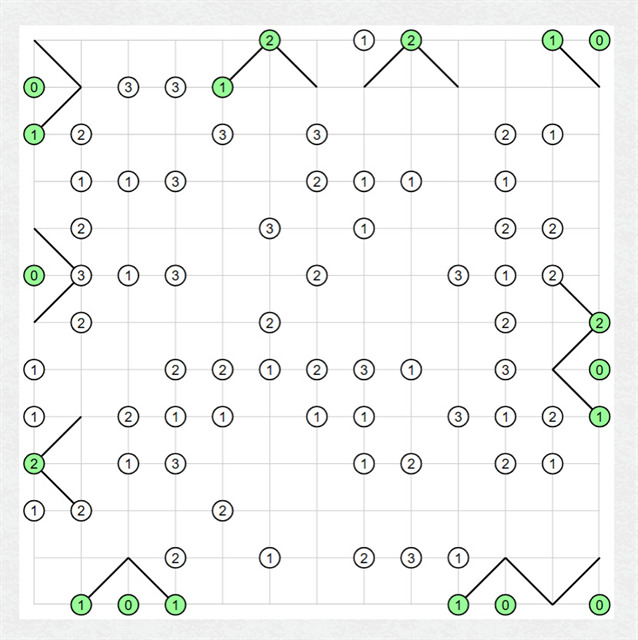 První kroky jsou jasné. Hledejte nuly (čára musí v políčkách vést tak, aby nevedla ke kolečku s nulou), čtyřky (ve všech čtyřech políčkách povede čára směrem ke čtyřce, tady zrovna čtyřky nejsou), dvojky na straně mřížky (u nich jsou jen dvě políčka, tudíž v obou políčkách povede čára směrem ke dvojce) a jedničky v rohu (ty tady nejsou). Co se dá takto doplnit je v následujícím obrázku.