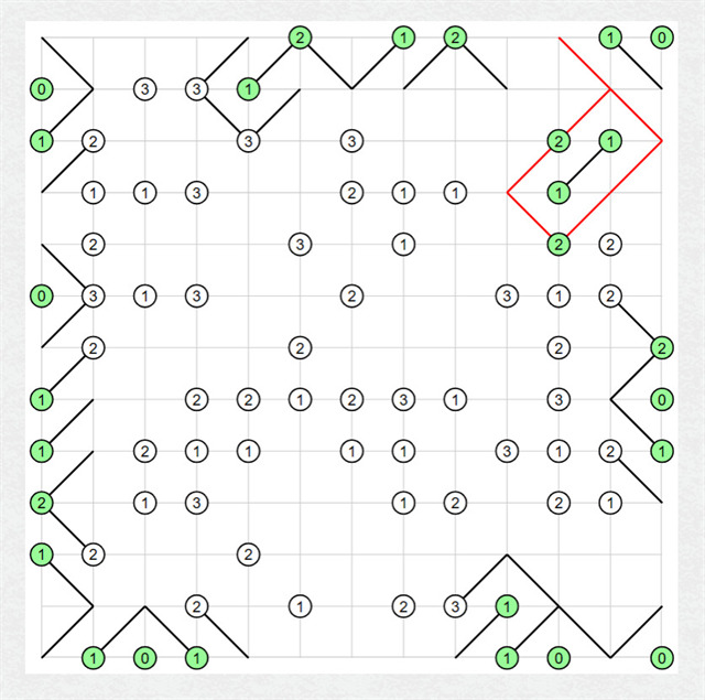 A nakonec se bude hodit opět trocha dedukce. Podívejte se zhruba doprostřed na bílá čísla 2 2 1 2 3 1. Od dvojky vlevo už vede jedna čára směrem vlevo dolů. Tím pádem u dvojky chybí jedna čára, která k ní povede a dvě, které ne. Z toho vyplývá, že na dvou políčkách vpravo (ktrerá patří i další dvojce) alespoň jedna čára (nebo obě) ke dvojce vlevo nepovedou. Což pro tu další dvojku platí obráceně. Takže pro tu to znamená, že alespoň jedna čára (nebo obě) k ní povedou. Ale u této dvojky vpravo už jednu čáru máme (směrem vpravo dolů). To znamená že na společných políčkách k ní může vést právě jedna čára. (zatím neurčíme, ve kterém z těch dvou políček) Co je ale důležité, vyplývá z toho, že takto budou obě čáry u dvojky vyřešené, tudíž v políčku vpravo nahoře čára ke dvojce nepovede. A ta tím pádem povede k jedničce.