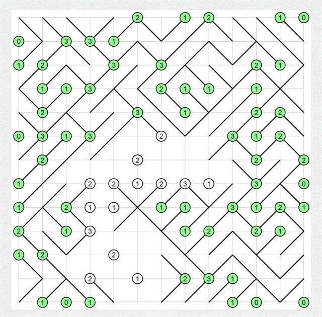 Tak např. pokud máte vedle sebe dvě jedničky (jednička znamená, že z tohoto bodu povede v jednom políčku jedna čára, v ostatních políčkách povedou úhlopříčky opačným směrem), dvě políčka mezi nimi jsou pro ně společná. V těchto dvou políčkách ale nemůžete nakreslit čáry tak, aby obě dvě z jedné jedničky nevedly: to by totiž znamenalo, že obě dvě povedou z té druhé a to je moc. Jediné řešení je, že jedna čára z jedné jedničky povede a druhá ne, pro druhou jedničku to tak výjde nastejno, jen obráceně. Sice vám takto stále zbývají dvě možnosti, důležitější ale je, že tím pádem čáry z jedniček jsou vyřešené a proto v políčkách, která nejsou společná, už čáry z jedniček nepovedou.
