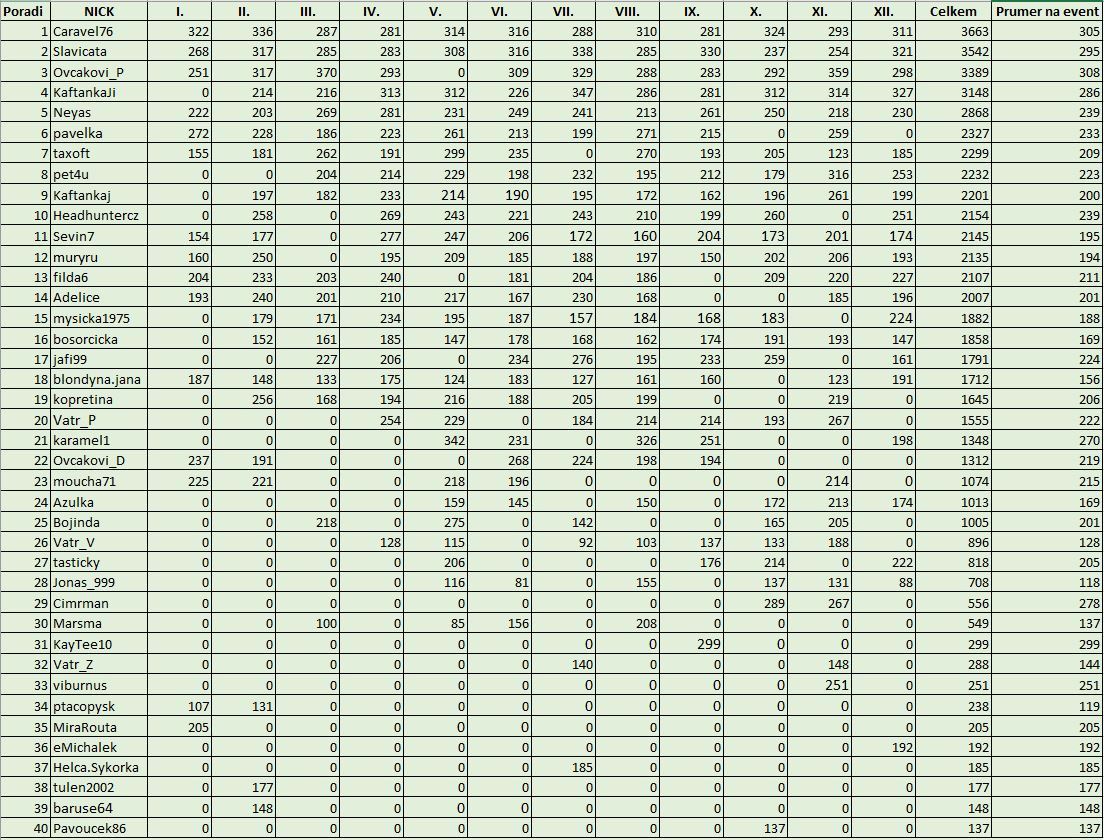 - Vitezem sezony bude hrac s nejvyssim souctem bodu za obe hry vsech eventu, kterych se ucastnil. Nezalezi jen na zrucnosti, lze vyvazit dochazkou :-).