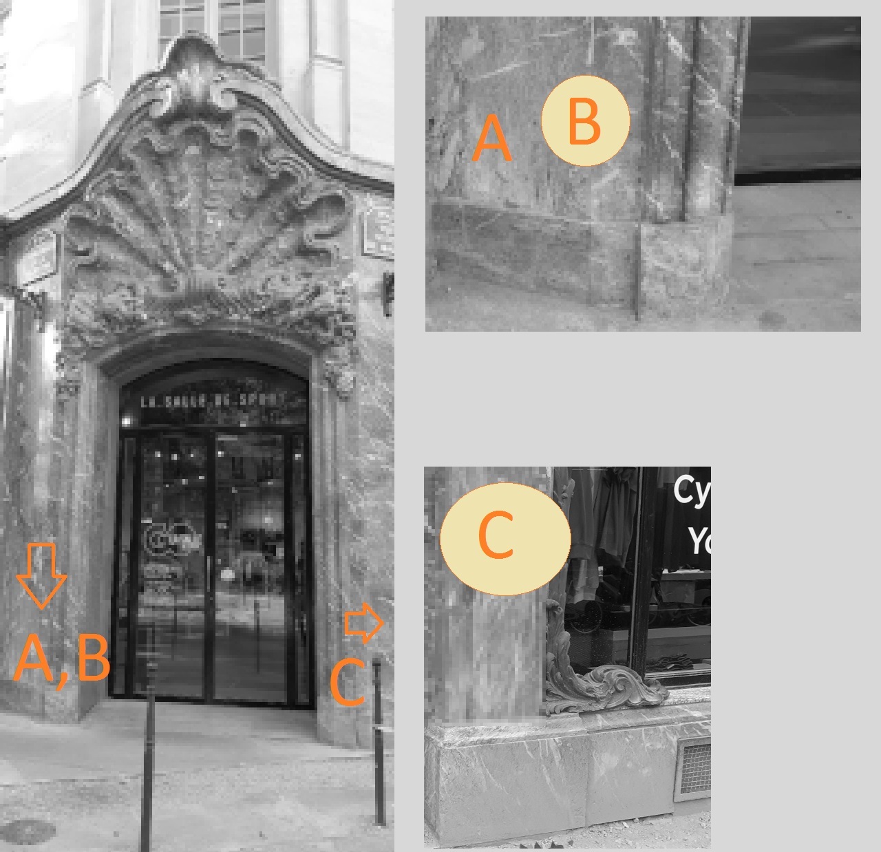 rock that you observe on this facade, in particular in A (color,