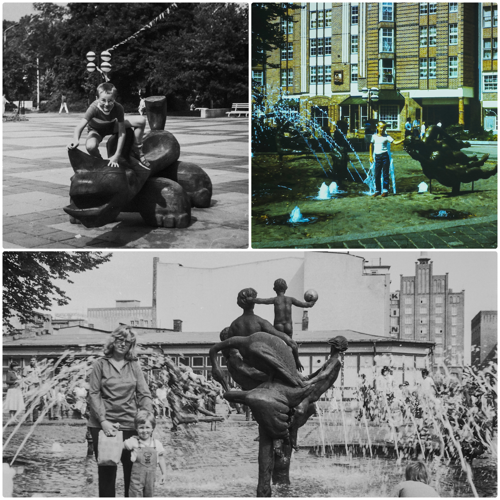 links: auf dem Holz-Nilpferd vorm Kröpeliner Tor (1985), rechts: am Brunnen der Lebensfreude (1987), unten: am Brunnen der Lebensfreude (1984, das Fünfgiebelhaus steht noch nicht)